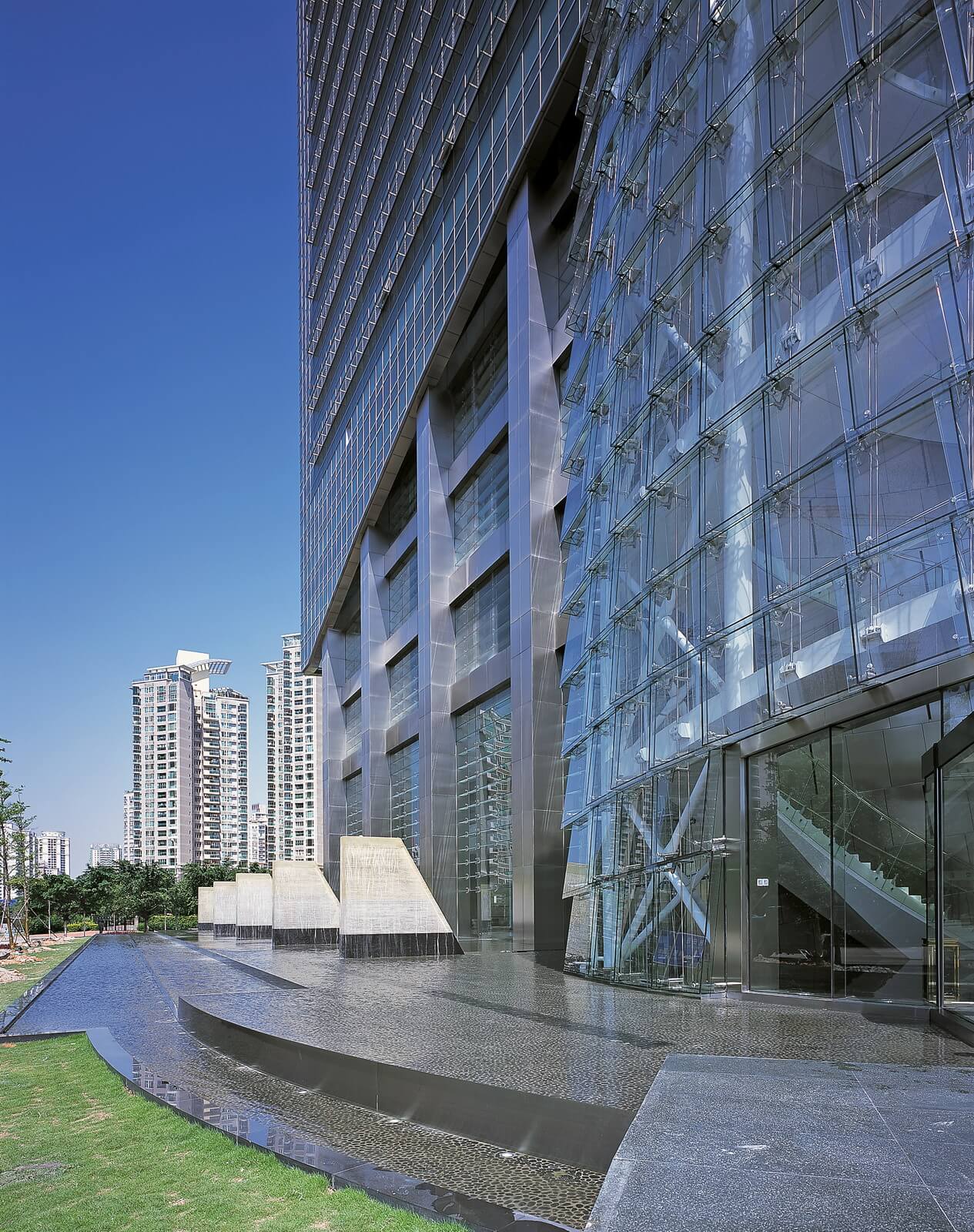 The exterior articulation of the building is characterized by a strong, stone clad ‘backbone’ on the north and a diaphanous glass ‘prism’ facing south. The transparent south wall makes the building appear light and open toward the City Center, while the punched openings in the stone clad north wall presents a timeless solidity to the rest of the city. The glass exterior wall consists of a compositional pattern of horizontal and vertical mullions with low reflective vision glass and ceramic frit patterned spandrel glass. An ever-changing complexity of pattern will be seen in the glass façade with the mullion pattern laid against the structural grid and the interior spaces beyond. This, along with the varied weather conditions of the region will create a constant dynamic play of light and shade .These layered complexities allow the tower form to remain simple, elegant and efficient and of subtle form and color, while presenting a dramatic punctuation on the Shenzhen skyline.