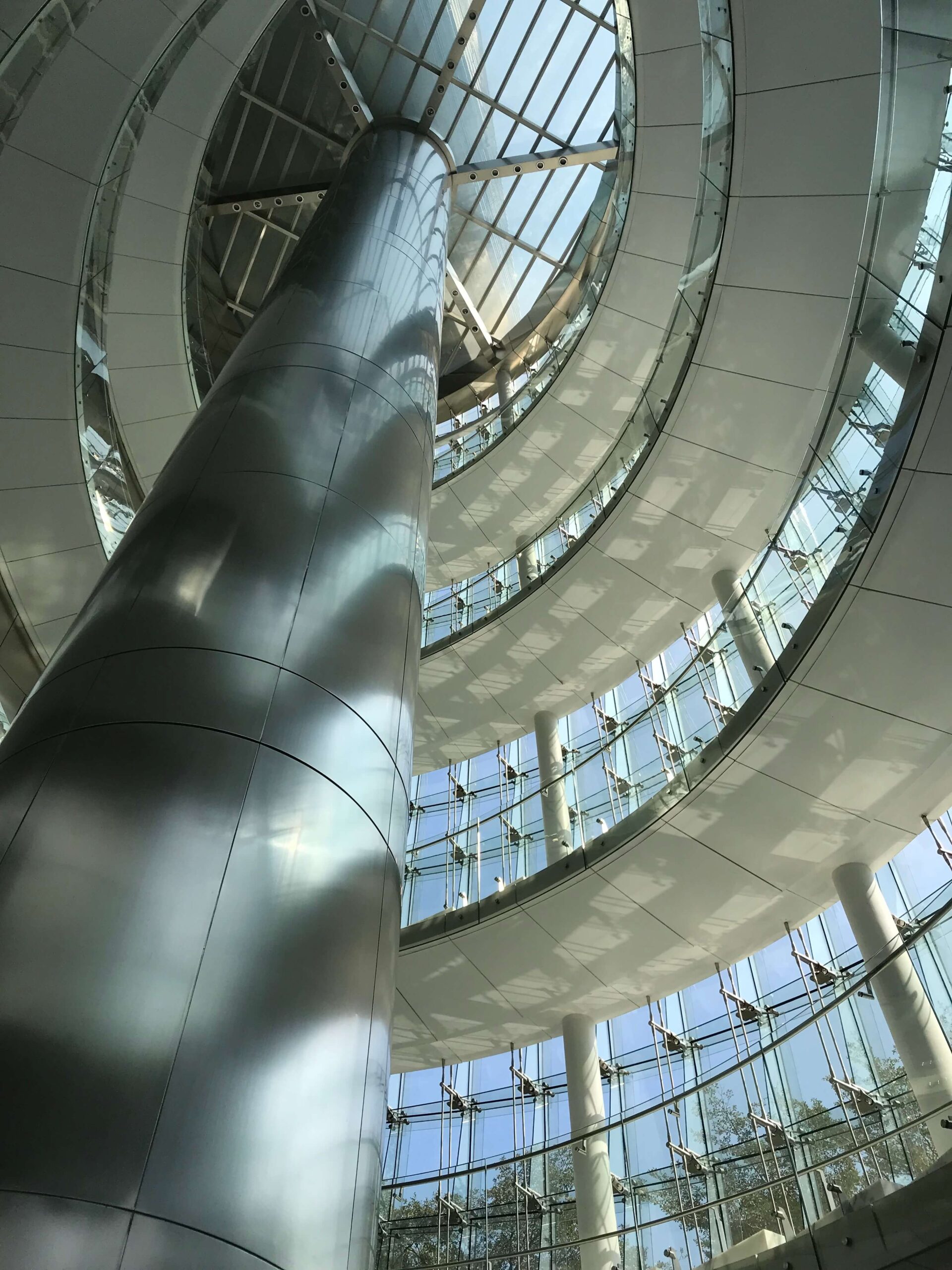 across the lobby to the water garden. From the west, the pedestrian passes over a ceremonial bridge that traverses the vast reflecting pool. From the east, this principle entry is given prominence over the others. An entry pavilion made of ‘fish scaled’ glass panels beckons people to enter the building and to climb the five-floor ramped stair connecting the podium levels and affording views over the city center. The entry pavilion is scaled to the lower government and cultural buildings. Fully glazed elevators serving the parking and podium levels as well as