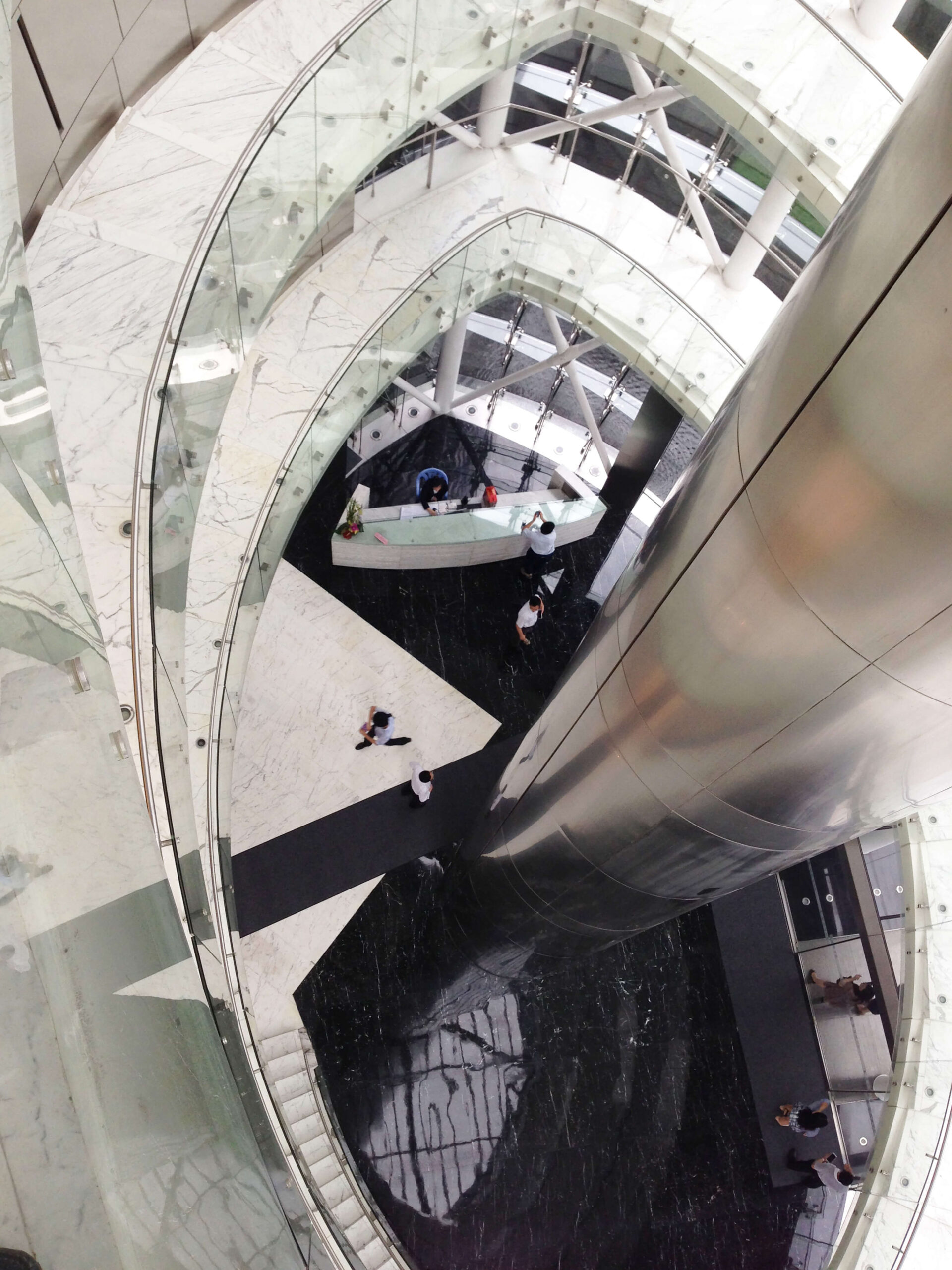 The lobby has a different character depending on your arrival point. From the north, the car drop off is given the formal treatment of a moon gate entrance infilled with glass that allows views