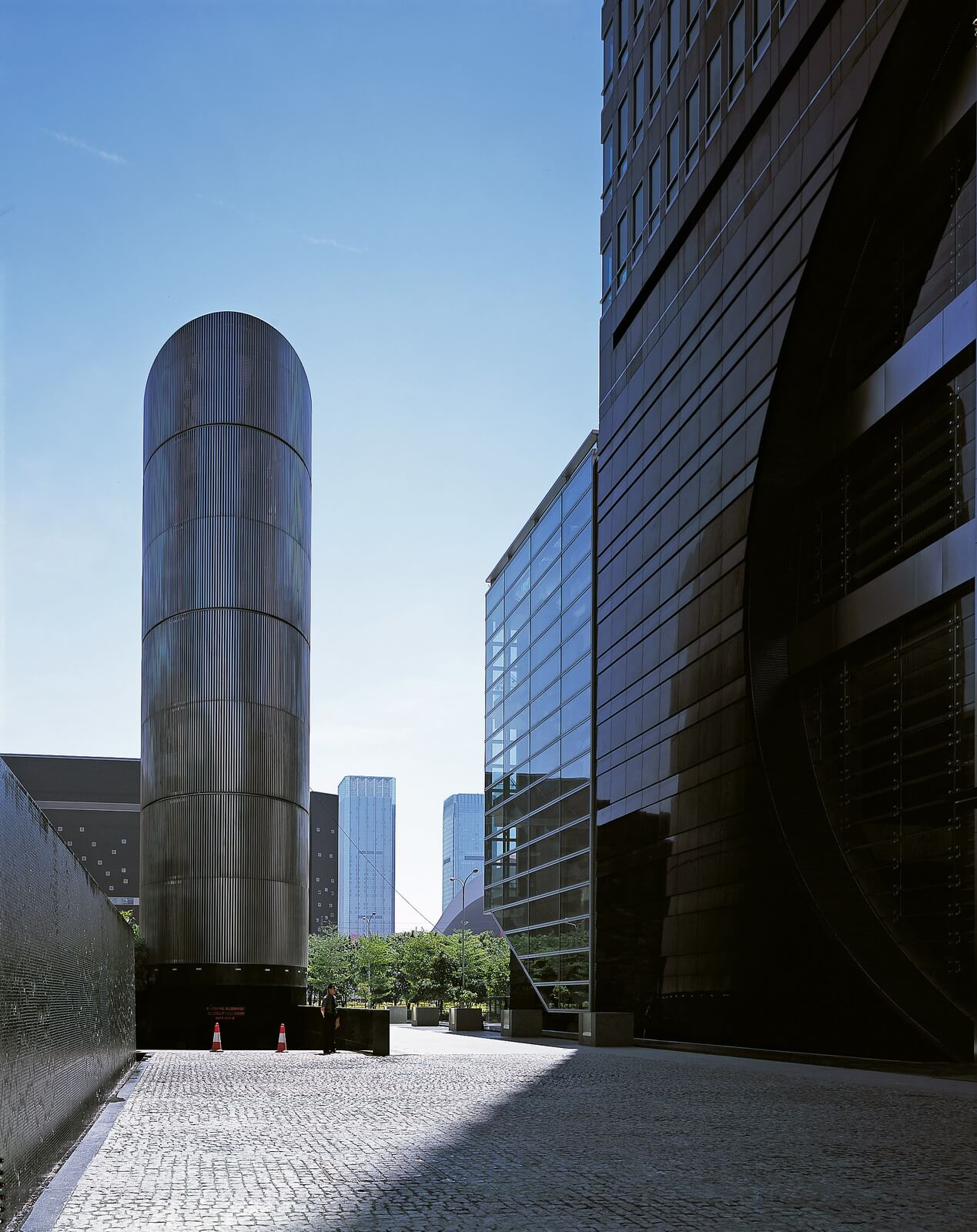 The slight 12 degree angle of the tower side walls transforms a ‘box-like’ shape into a powerful form. It also maximizes the south facing perimeter wall viewing over the Central Zone’s greenbelt axis. Two features of the upper floors include a ‘sail-like’ glass panel, which is tilted toward the east and an atrium office on the top floor.